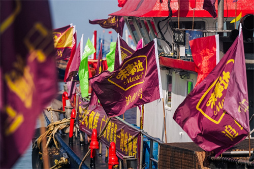 开渔节港口,挂有味事达旗帜的头船阵列